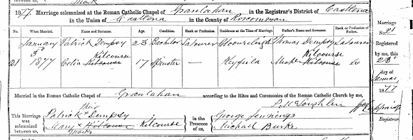 Thomas's son Patrick's marriage to Celia Kilcourse January 3rd, 1877 (this is his son, not his grandson in the 1911 census above). Celia signed as Mary? Correction shows that too?