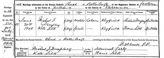 Michael Dempsey of Keyfield marries Kate Silk in 1908. I would have thought this was Thomas's grandson Michael, born 1877. But his father was Thomas's son Patrick (who moves to Keyfield), not Michael ... more mysteries!